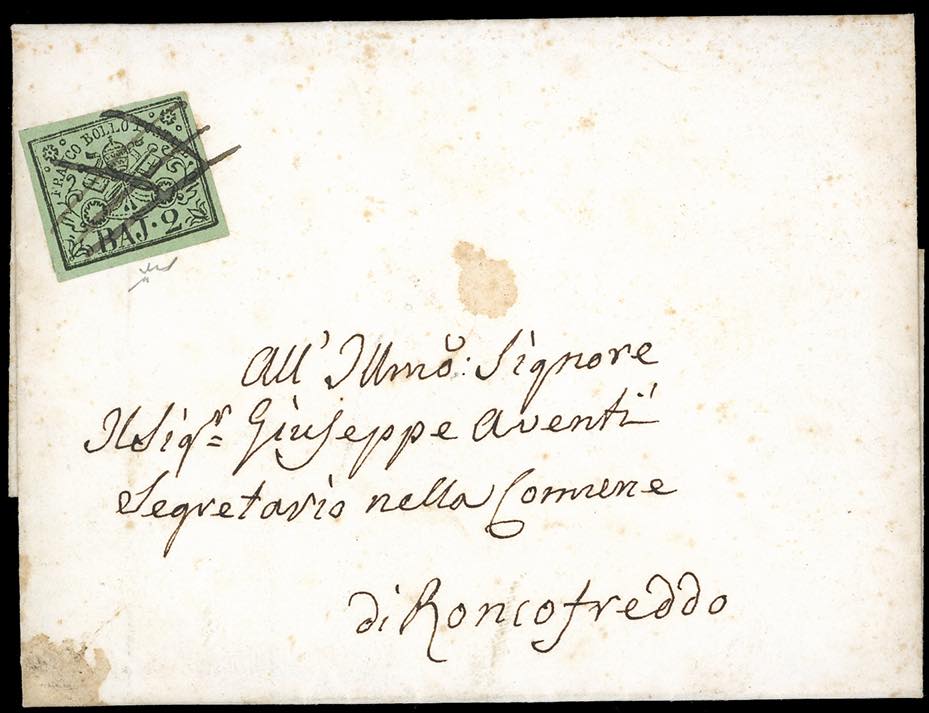 1852/63 - 2 baj, tre esemplari (3,3Ab), su altrettante lettere, senza testo interno, spedite da località dipendenti dall'ufficio del Circondario di Roma per la città, tutti annullati a penna. Interessanti. Chiavarello/Ferrario. Ex coll. Imperato.