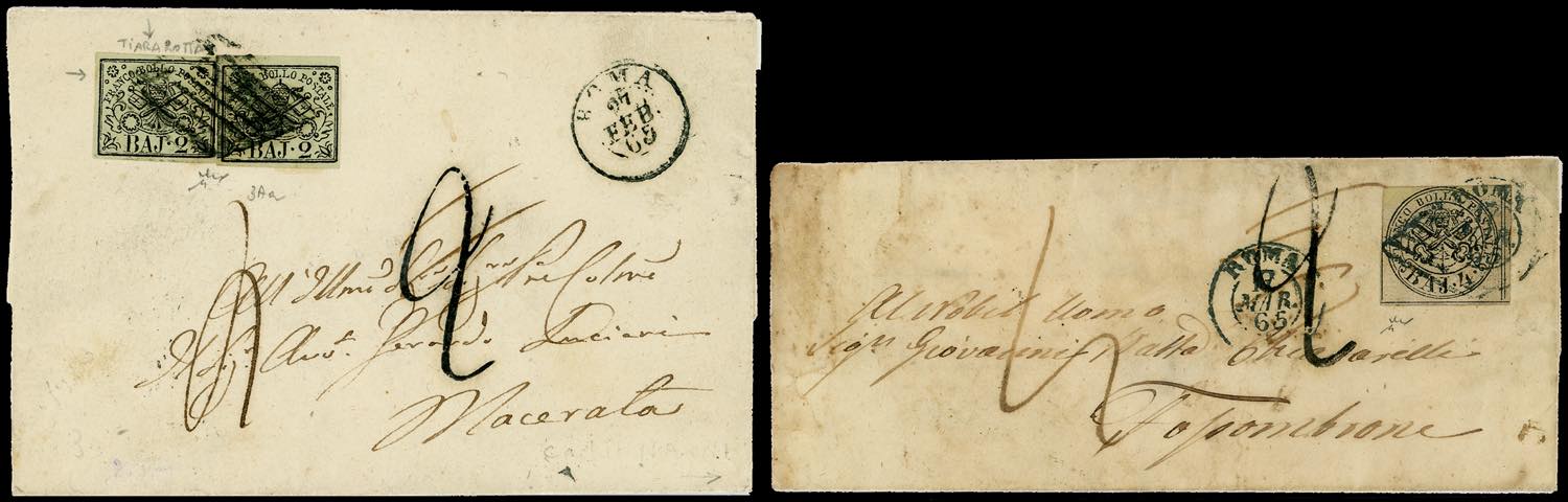 1865 - Due lettere affrancate per il Regno d'Italia, una con 2 baj (3Aa), due esemplari, l'altra con 4 baj (5A), entrambe inizialmente tassate 20 cent., poi corrette in 40 cent. per il doppio porto. Chiavarello. Ex coll. Imperato.