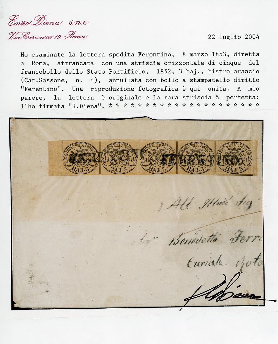 1853 - 3 baj bistro arancio (4), striscia orizzontale di cinque, bordo di foglio nei due lati verticali, perfetta, su sovracoperta di lettera da Ferentino a Roma 9/3/1853. Molto rara e di ottima qualità. Cert. Diena.