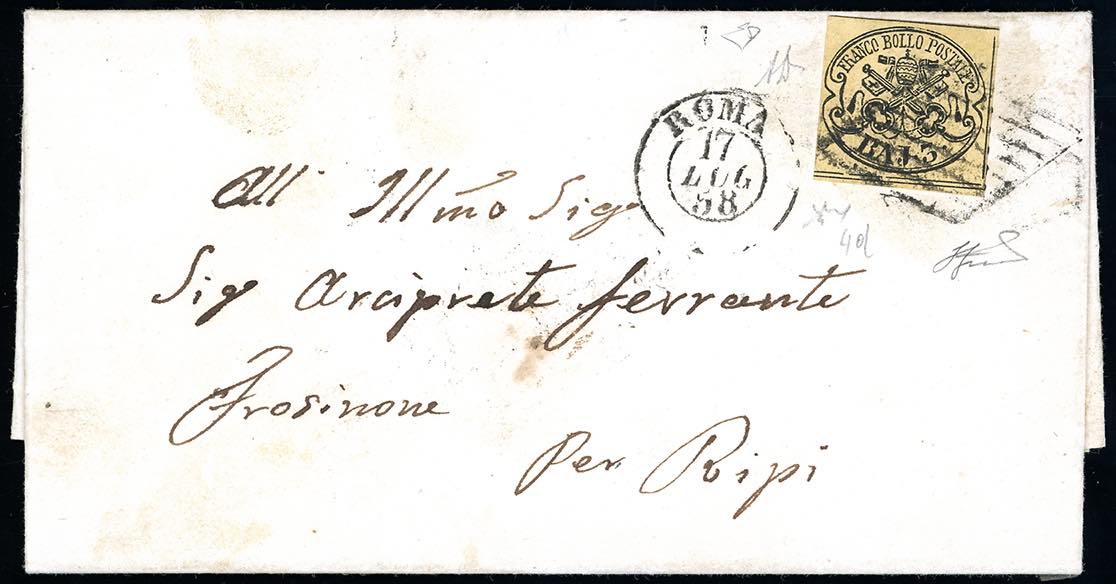 1858 - 3 baj giallo paglia (4d), perfetto, su lettera da Roma 17/7/1858 a Ripi. Pregevole tinta. A. ed E.Diena, Chiavarello, cert. ... Read more