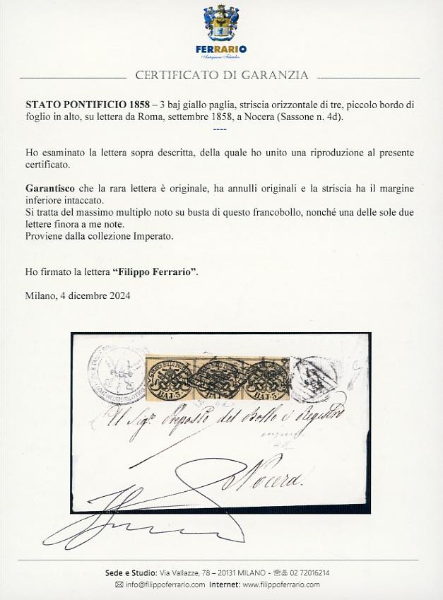 1858 - 3 baj giallo paglia (4d), striscia orizzontale di tre, piccolo bordo di foglio in alto, margine inferiore intaccato, su lettera da Roma, settembre 1858, a Nocera. Si tratta del massimo multiplo noto su busta di questo francobollo, una delle sole due lettere finora note. E.Diena, cert. Ferrario. Ex coll. Imperato.