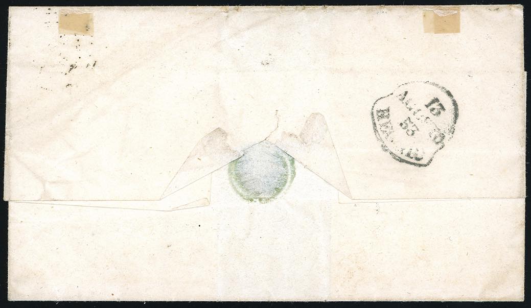1853 - 4 baj bruno grigio chiaro (5), coppia orizzontale con interspazio di gruppo al centro, perfetta, su lettera da Ancona 11/8/1853 a ... Read more