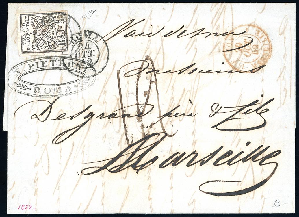 1852 - 5 baj rosa chiaro (6), perfetto, su fresca lettera da Roma 24/10/1852 a Marsiglia, tassata 12. Ferrario. Ex coll. Imperato.
