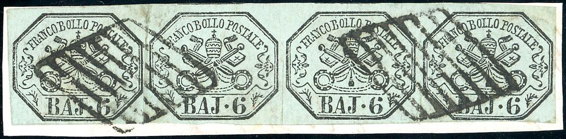 1852 - 6 baj grigio verdastro (7), striscia orizzontale di quattro, colore molto vivo, perfetta, usata su piccolo frammento. Sorani, ... Read more