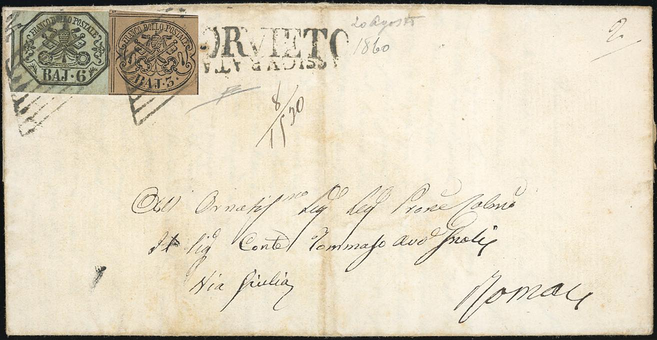 1860 - 6 baj grigio verdastro, 3 baj bruno (7,4Aa), il primo sfiorato in alto, su lettera assicurata da Orvieto 18/8/1860 a Roma. R.Diena.
