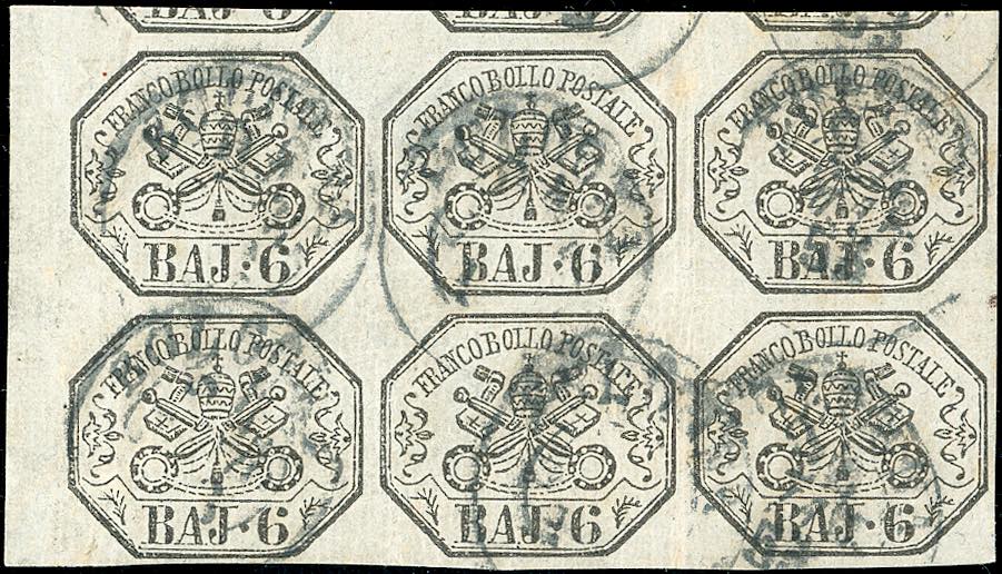 1852 - 6 baj grigio (7a), blocco di sei, bordo di foglio a sinistra, perfetto, impercettibile grinza di applicazione su un esemplare, usato con bollo datario di Bologna. Raro. Cert. Ferrario. Ex coll. Imperato. (cat. Sassone € 10.500 per il blocco di quattro)
