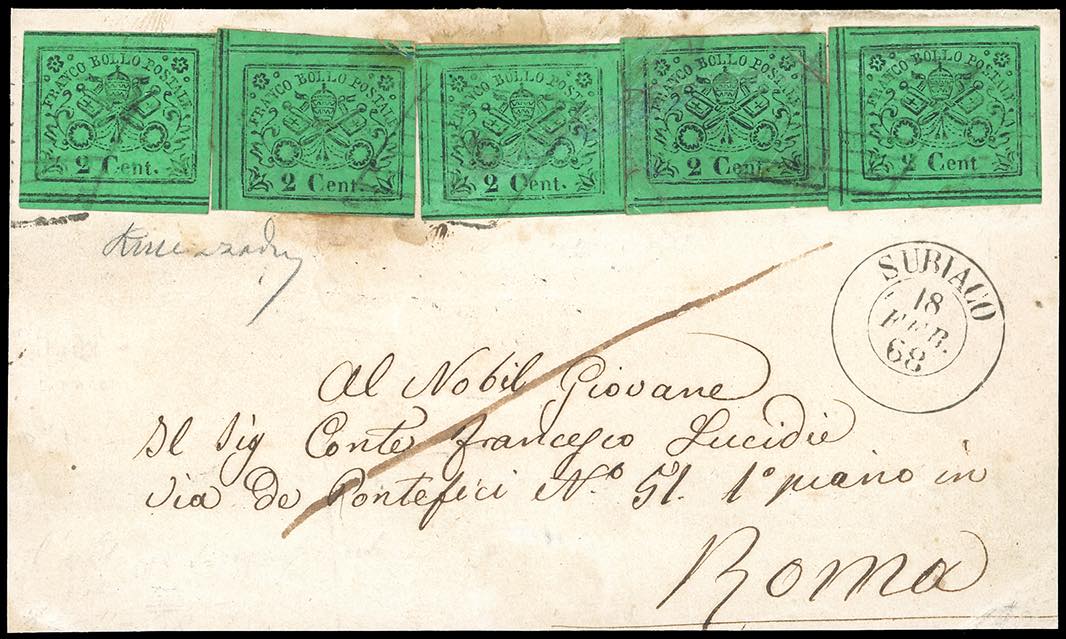 1868 - 2 cent. verde giallo (13), cinque esemplari, ben marginati, ottimo stato, su lettera parzialmente incompleta al verso da Subiaco 18/2/1868 a Roma, bollo d'arrivo. Bella e rara affrancatura multipla monovalore. Mezzadri. Ex coll. Imperato.
