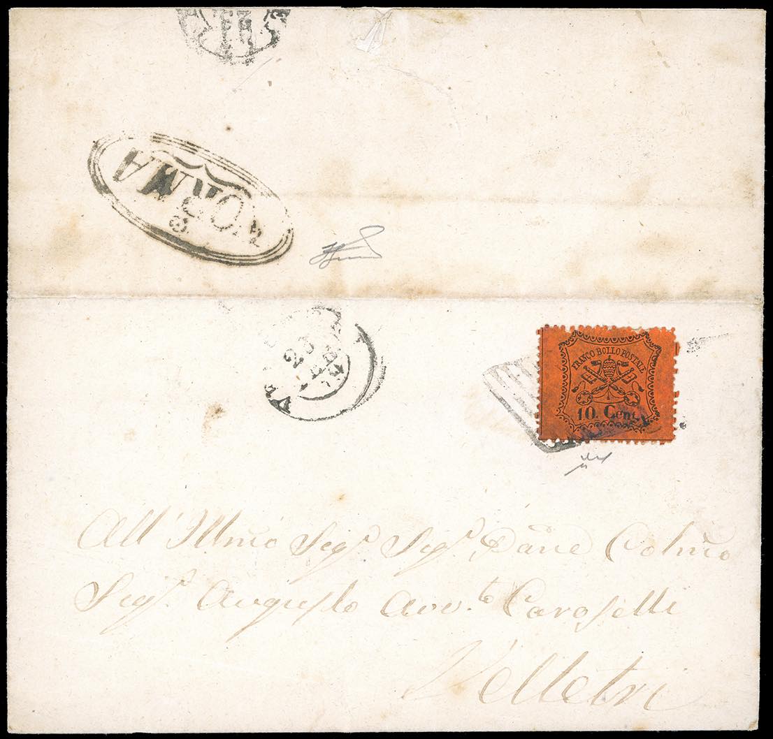 NORMA, punti R1 - 10 cent. (26), perfetto, su lettera del 22/2/1869 per Velletri, transito di Viterbo sul fronte. Rara. Chiavarello, cert. Ferrario. Ex coll. Imperato.