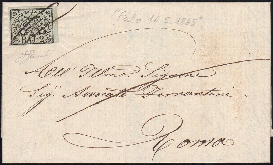 PALO, a penna punti R1 - 2 baj (3Aa), perfetto, su lettera del 16/5/1865 per Roma, in porto pagato. Rara! Ferrario.