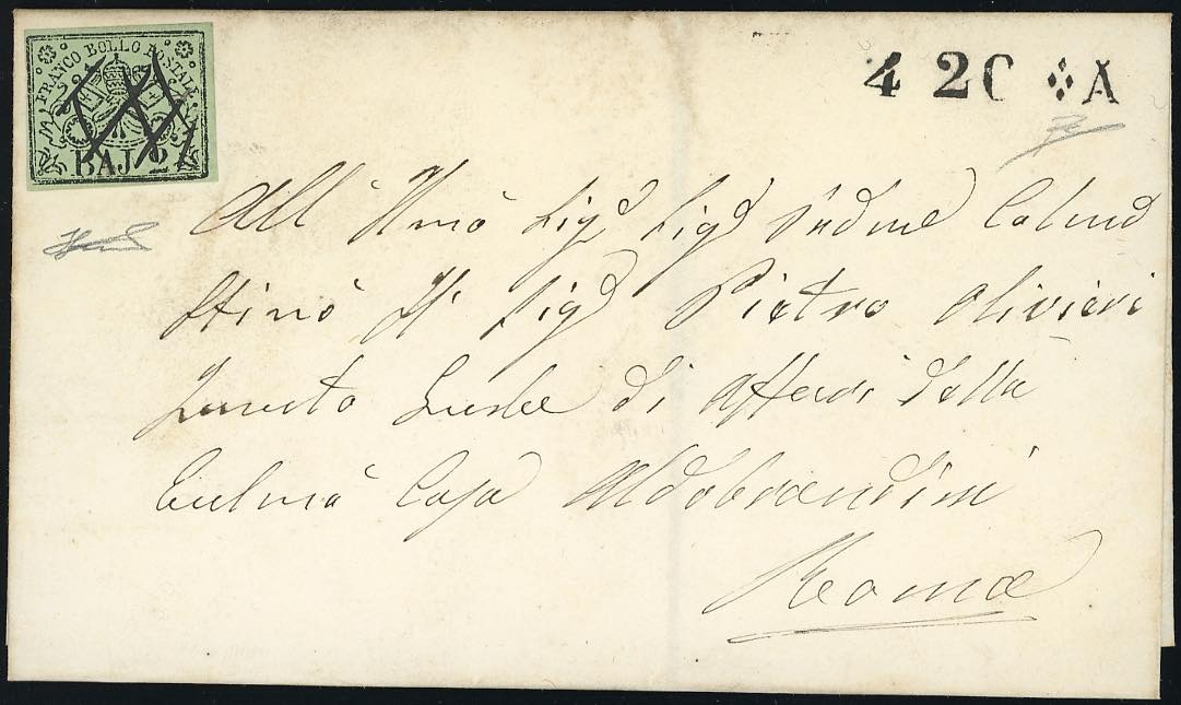 ROMA-FRASCATI, datario con A e fregio punti 12 - 2 baj (3), perfetto, annullato con tratti incrociati di penna, su sovracoperta di lettera da Frascati a Roma, trasportata con la IV corsa. Rara. R.Diena, cert. Ferrario.