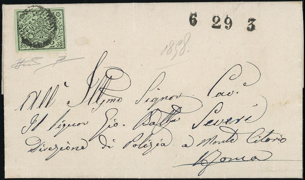 ROMA-FRASCATI, punti 10 - 2 baj (3), perfetto, annullato con il bollo muto a trattini su lettera da Frascati 29/3/1858 a Roma, trasportata con la VI corsa del treno. Molto bella! R.Diena, Ferrario.