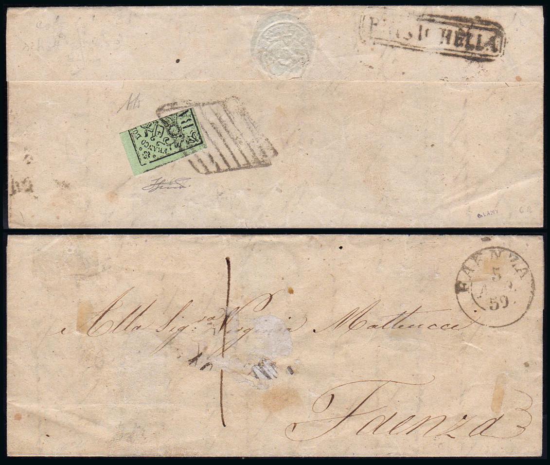 1859 - 2 baj verde oliva (3), frazionato verticalmente a metà, perfetto, al verso di sovracoperta di lettera in porto assegnato da Brisighella 5/8/1859 a Faenza, tassata 1 bajocco. Interessante uso in un centro minore. Ferrario. Cert. A.Diena.