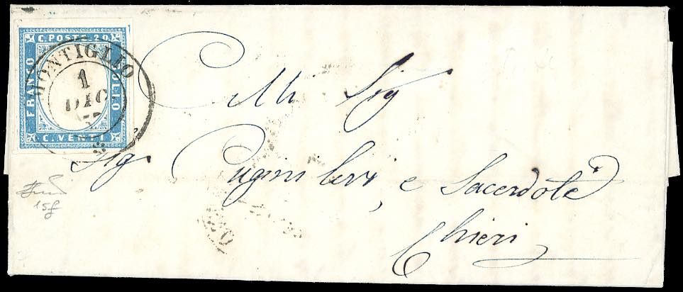 PIEMONTE-MONTIGNO, punti 7 - 20 cent. (15f), perfetto e ben marginato, su fresca lettera del 1/12/1857 per Chieri. Molto bella. Ferrario.