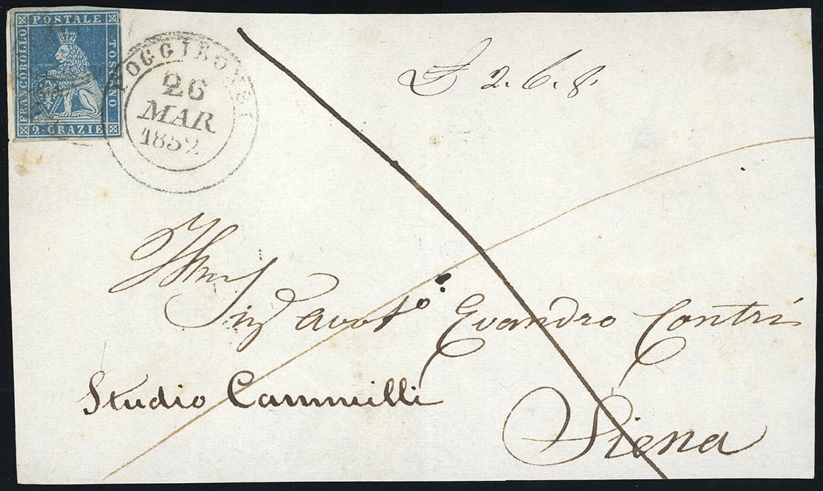 1852 - 2 crazie azzurro su grigio (5d), sfiorato a destra, su frontespizio di lettera da Poggibonsi 26/3/1852 a Siena, manoscritto "L.2.6.8". Interessante, da studiare.