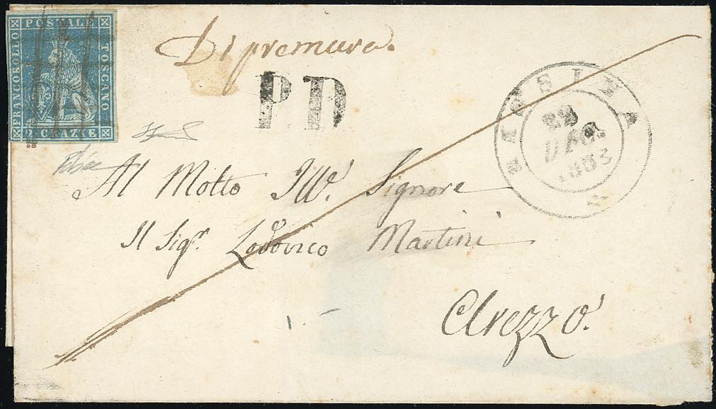 RASSINA, a penna punti 7 - 2 crazie (5), a filo a sinistra, su sovracoperta di lettera, bollo d'arrivo, del 22/12/1853 ad Arezzo. R.Diena, Ferrario.