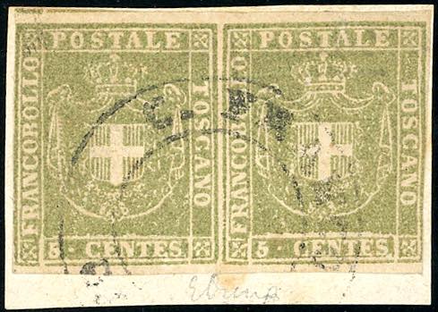 CASTELFRANCO DI SOTTO, punti 13 - 5 cent. verde oliva (18a), coppia sfiorata a destra su piccolo frammento. Rara. Emilio Diena, Ferrario.