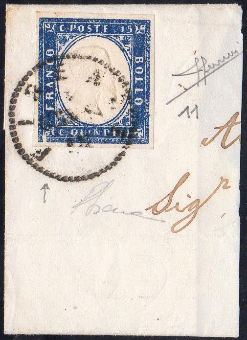 FIRENZE, cerchio formato da punti - 15 cent. tipo Sardegna (11), perfetto, usato su frammento con il bollo datario a cerchio formato da ... Read more