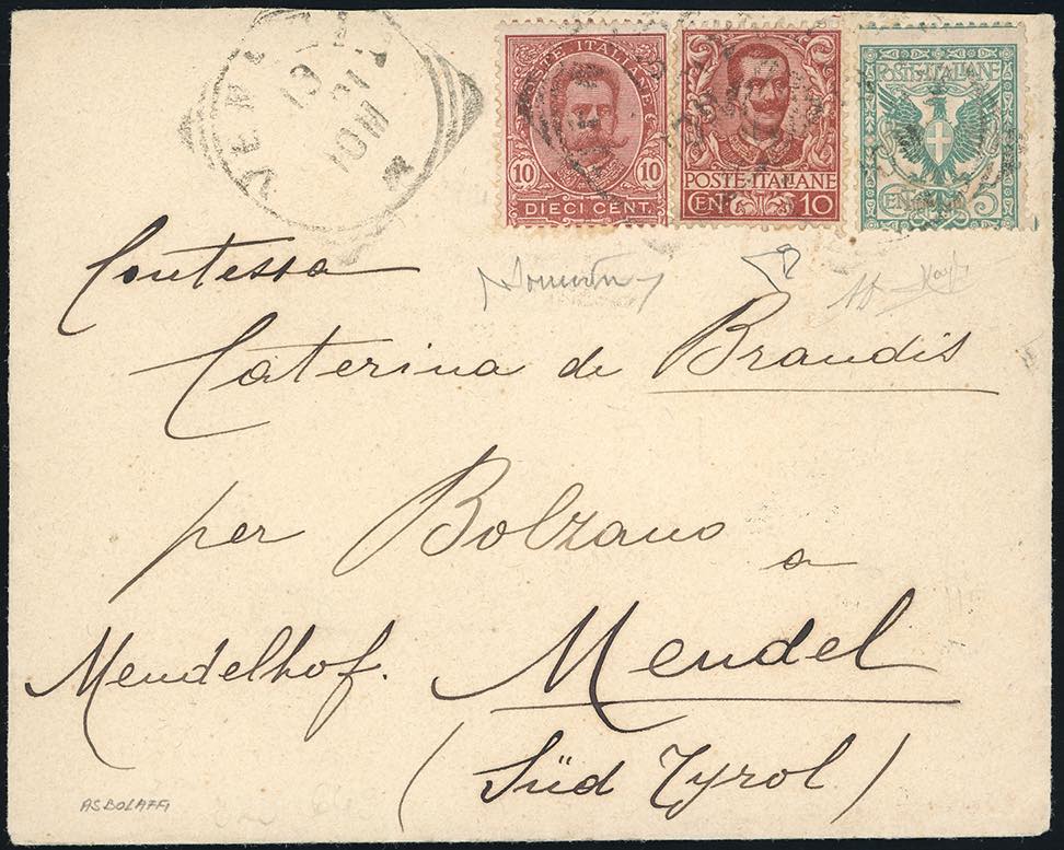 1901 - 10 cent. Umberto I, 5 cent. e 10 cent. Floreale (60,70,71), perfetti, su busta da Venezia a Mendel, Sud Tirolo. Rara affrancatura di valori gemelli "due Re". A.Diena, Raybaudi, cert. E.Diena.