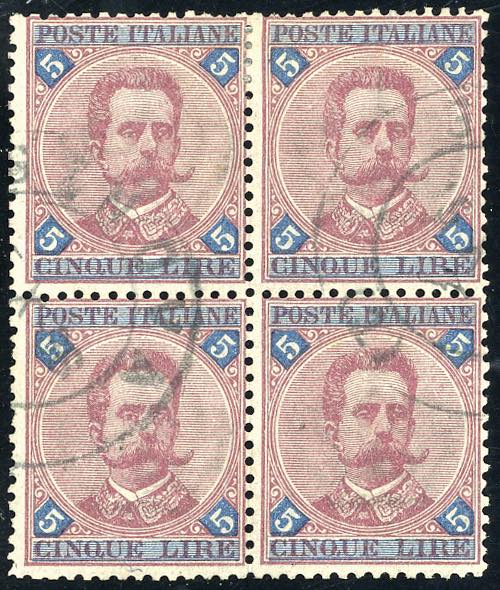 1891 - 5 lire carminio e azzurro Umberto I (64), ottimo stato, usato. Raro. A.Diena.