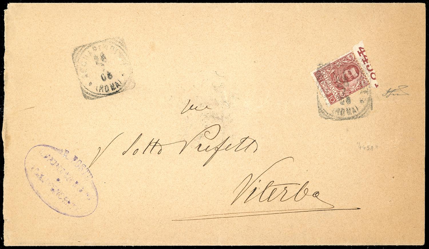 1908 - 10 cent. Floreale (71), bordo di foglio in alto con parziale numero di tavola "4458" su lettera da Acquapendente 28/6/1908 a ... Read more