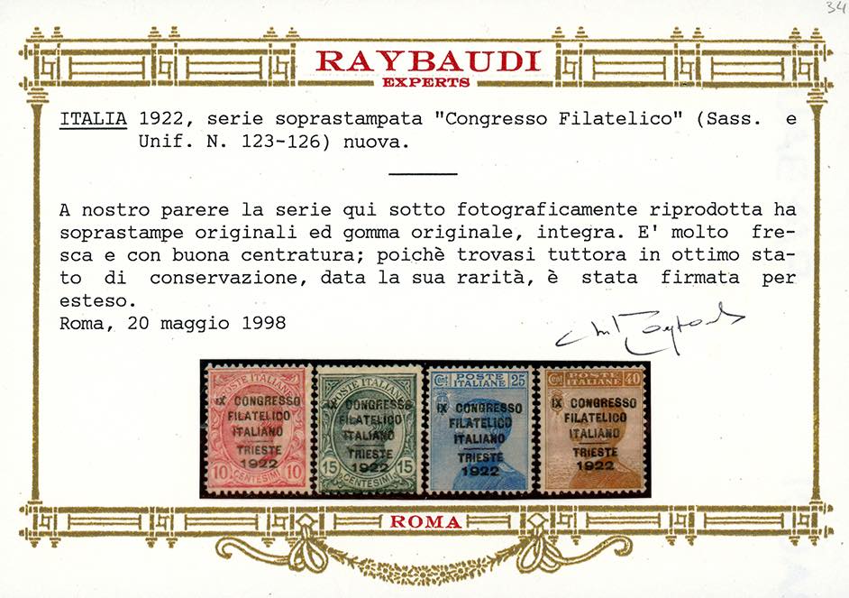 1922 - Congresso Filatelico, soprastampati, serie completa (123/126), discreta centratura, gomma originale integra, perfetti. A.Diena, cert. Oro Raybaudi.
