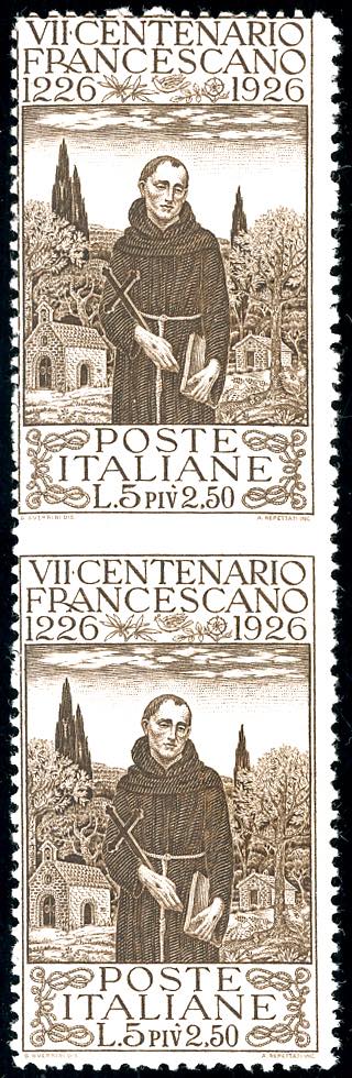 1926 - 5 + 2,50 lire San Francesco, coppia verticale non dentellata al centro (197l), gomma originale integra, perfetta. Cert. Caffaz.
