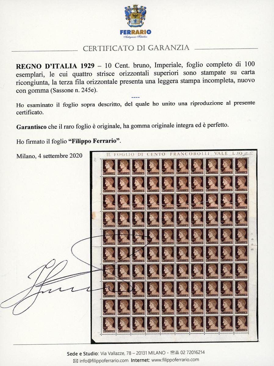 1929 - 10 cent. Imperiale, foglio completo di 100 esemplari, le quattro strisce di 10 esemplari superiori stampate su carta ricongiunta per un totale di 40 esemplari con tale varietà (245e), gomma integra, perfetto. Bello e raro. Cert. Ferrario.