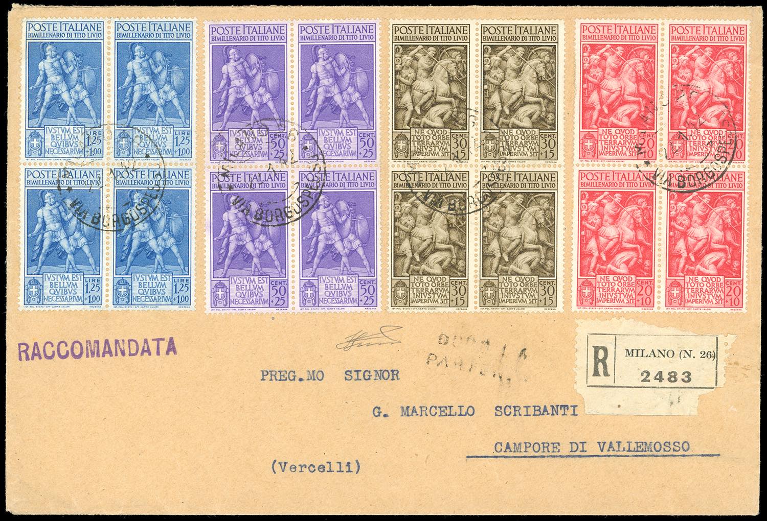 1942 - Tito Livio, serie completa (458/461), blocchi di quattro, perfetti, su busta raccomandata da Milano 22/1/1942 a Campore di Vallemosso. Ferrario.