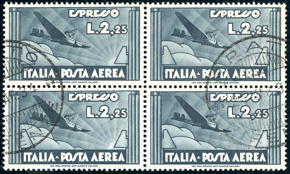 1933 - 2,25 lire espresso aereo (44), blocco di quattro, usato, perfetto. Raro. Ferrario.