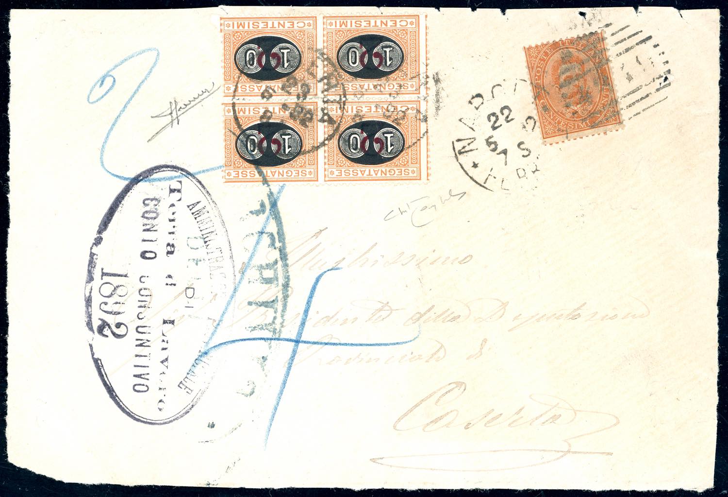 1892 - 10 cent. su 2 cent. Mascherine (17) blocco di quattro, ottimo stato, usato in arrivo su frontespizio di busta insufficientemente affrancata con 20 cent. Umberto I (39), da Napoli 22/5/1892 a Caserta, dove è stata tassata. Raro multiplo su documento postale. Cert. Raybaudi e Sorani.