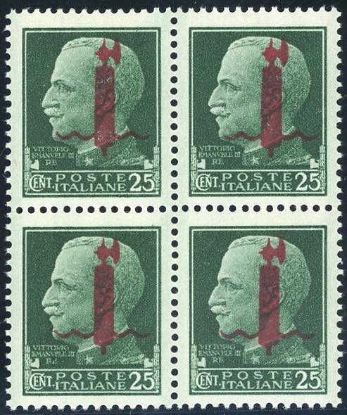 Lot 1870 - 1944 - 25 cent. soprastampato fascio in rosso (490), blocco ...