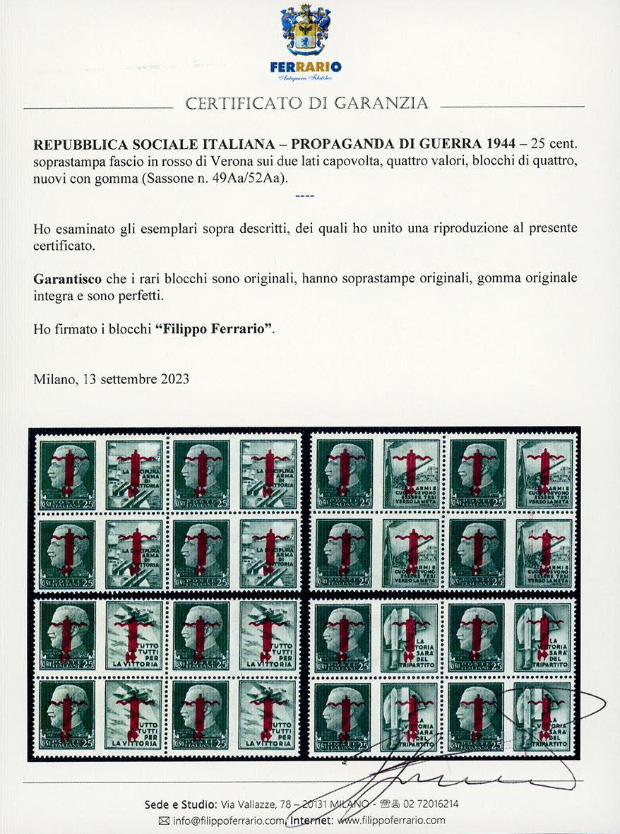 1944 - 25 cent. soprastampa fascio in rosso di Verona sui due lati capovolta, quattro valori (49Aa/52Aa), blocchi di quattro, gomma originale integra, perfetti. Molto rari e di ottima qualità. Raybaudi, cert. Ferrario.