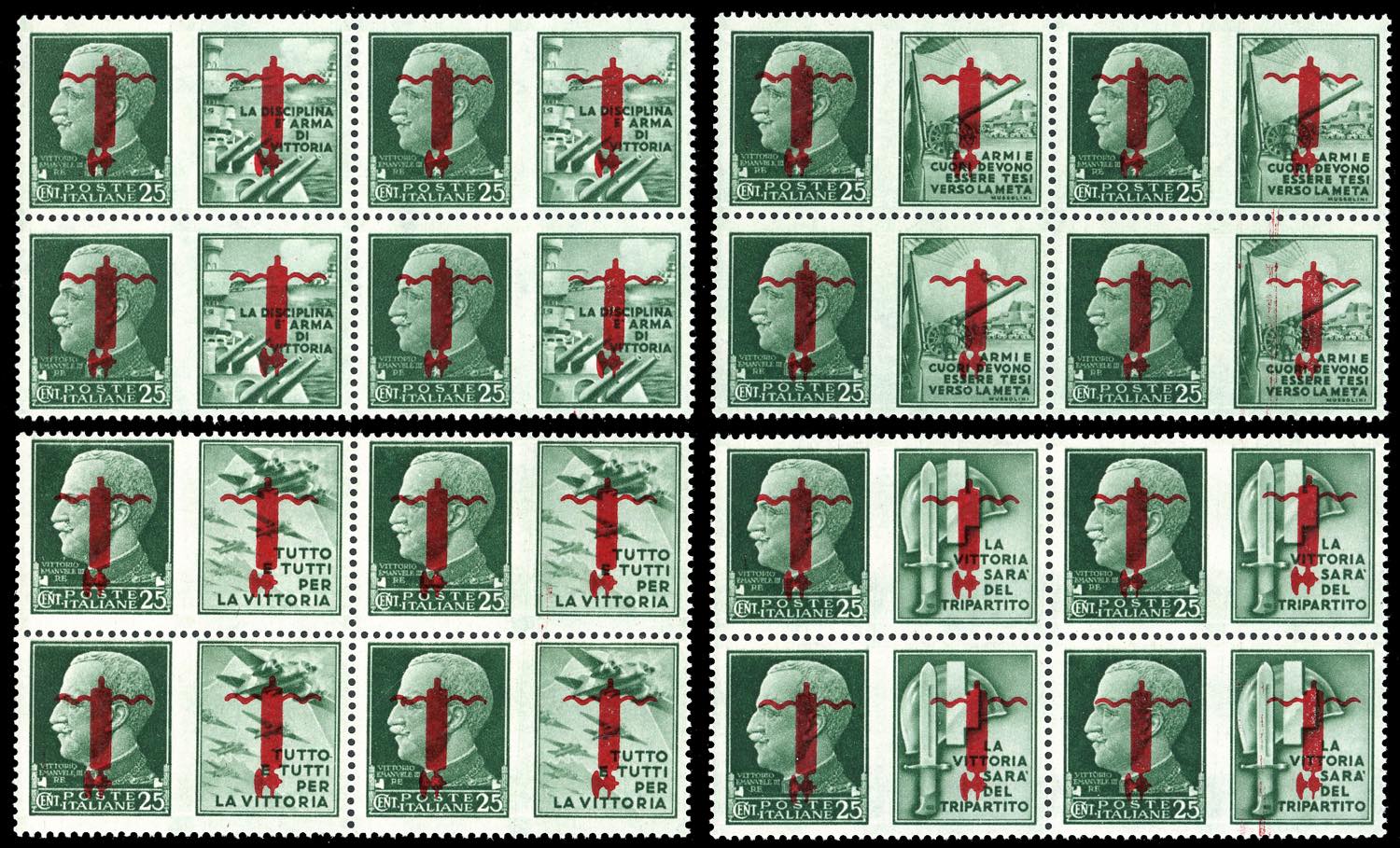1944 - 25 cent. soprastampa fascio in rosso di Verona sui due lati capovolta, quattro valori (49Aa/52Aa), blocchi di quattro, gomma ... Read more