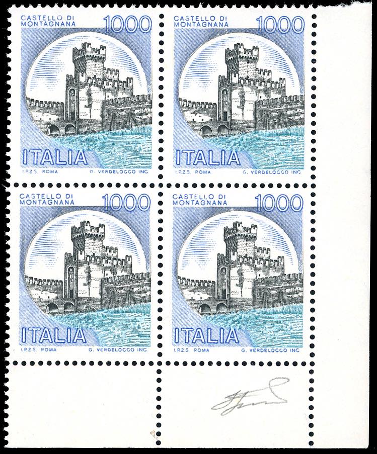 1980 - 1.000 lire "Castello celeste", francobollo naturale (cat. Bolaffi 1632B), blocco di quattro, angolo di foglio, gomma originale integra, perfetto. Raro. Cert. Ferrario, fotocopia cert. Caffaz del blocco di provenienza.