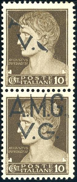 1945 - 10 cent. Imperiale (1), coppia verticale, un esemplare con soprastampa parziale, l'altro con soprastampa fortemente spostata in ... Read more