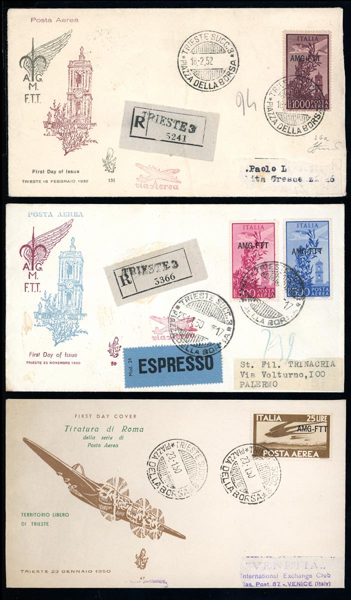 POSTA AEREA 1949/52 - Soprastampati su una riga, serie completa, il 1.000 lire Campidoglio dent. 14 x 14 1/4 (A20/A25,A26a), perfetti, su sei buste FDC Venetia, tra cui due raccomandate. Ferrario per il 26a.