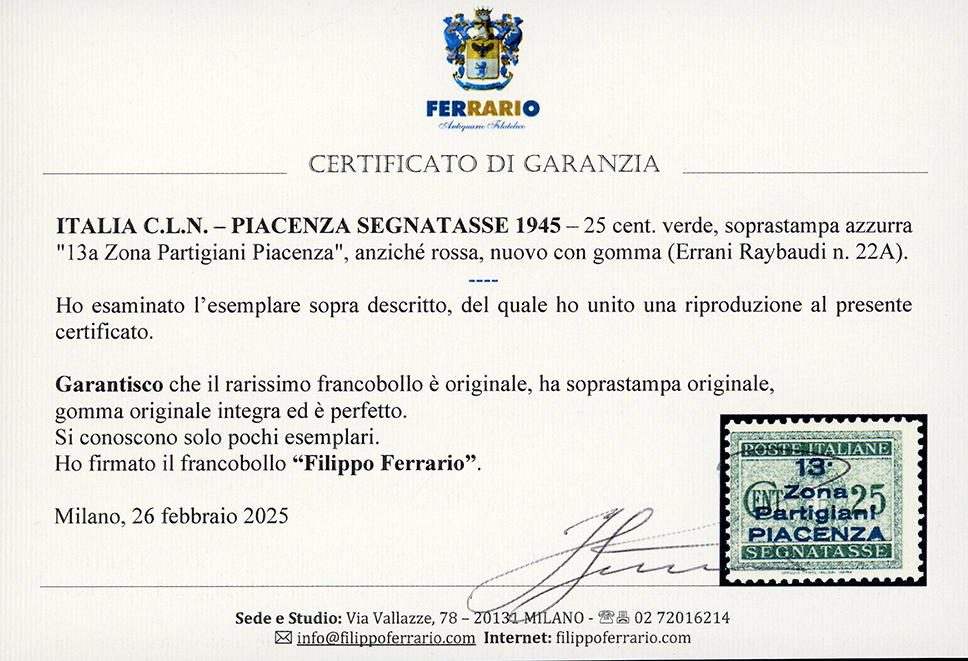 PIACENZA SEGNATASSE 1945 - 25 cent., soprastampa azzurra anziché rossa "13a Zona Partigiani Piacenza" (Errani Raybaudi 22A), nuovo, gomma originale integra, perfetto. Estremamente raro, pochissimi esemplari noti. Cert. Ferrario.