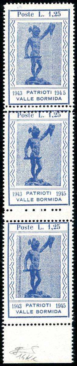 VALLE BORMIDA 1945 - 1,25 lire azzurro Perseo, striscia verticale di tre con doppia dentellatura tra il primo e il secondo e tra il secondo ... Read more