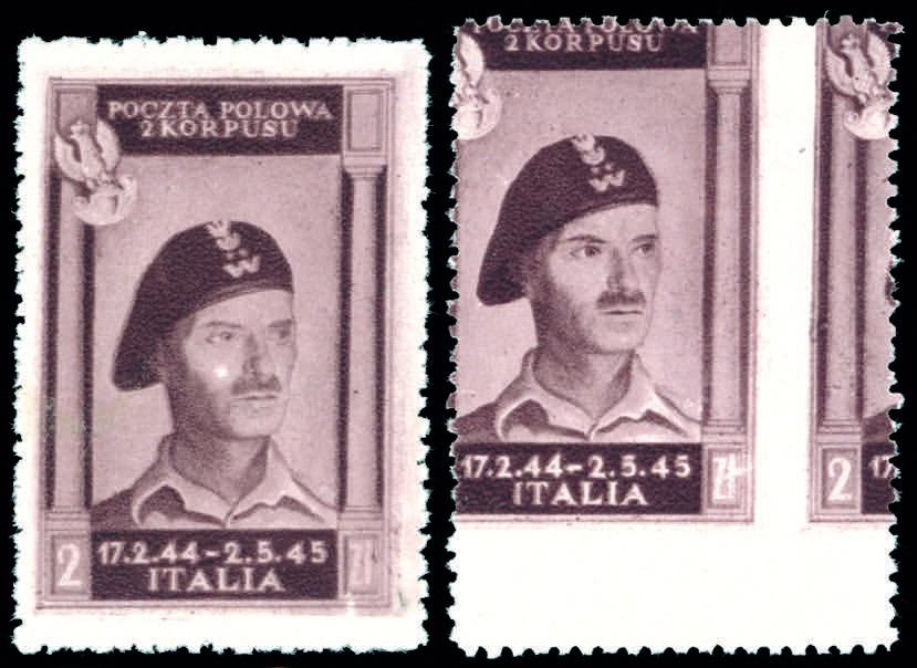 1946 - 2 z. bruno lillaceo Vittorie polacche, un esemplare tipo e uno con dentellatura fortemente spostata in basso e a destra (17,17e), senza gomma come sempre, perfetti.
