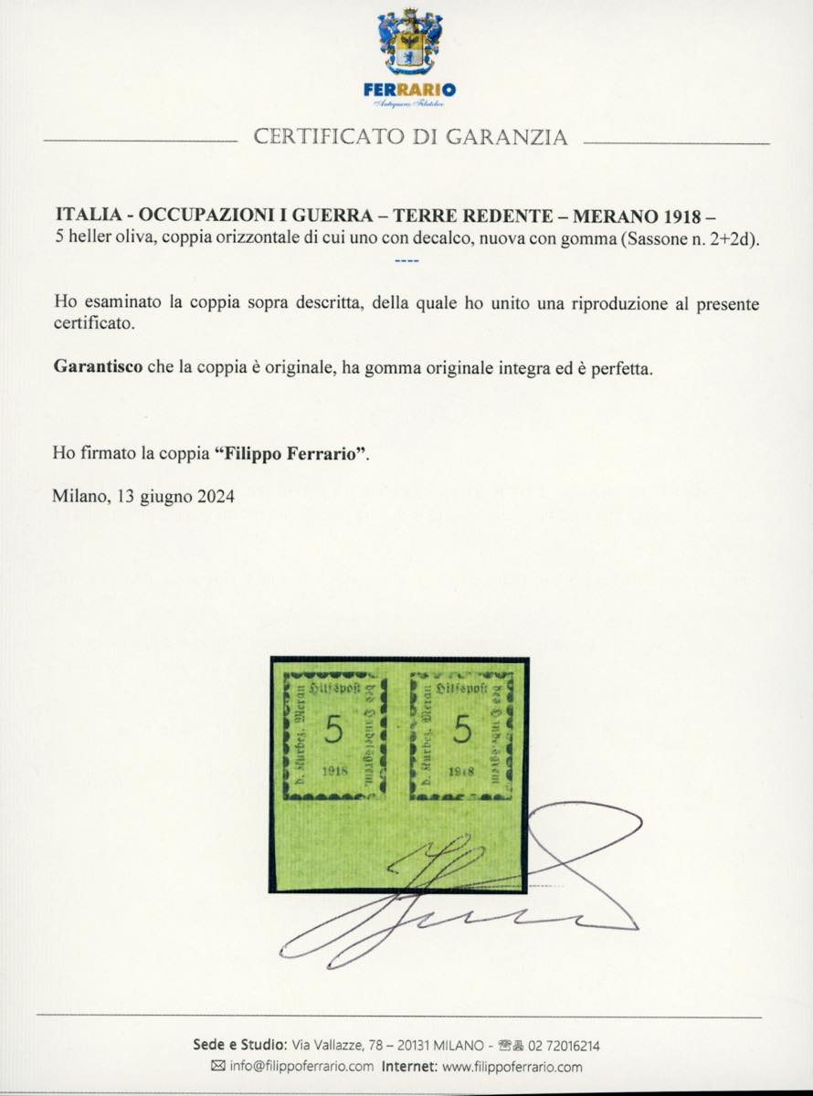 MERANO 1918 - 5 h. oliva, coppia orizzontale di cui uno con decalco (2+2d), nuova, gomma originale integra, perfetta. Bellissima. Avi, cert. Ferrario.