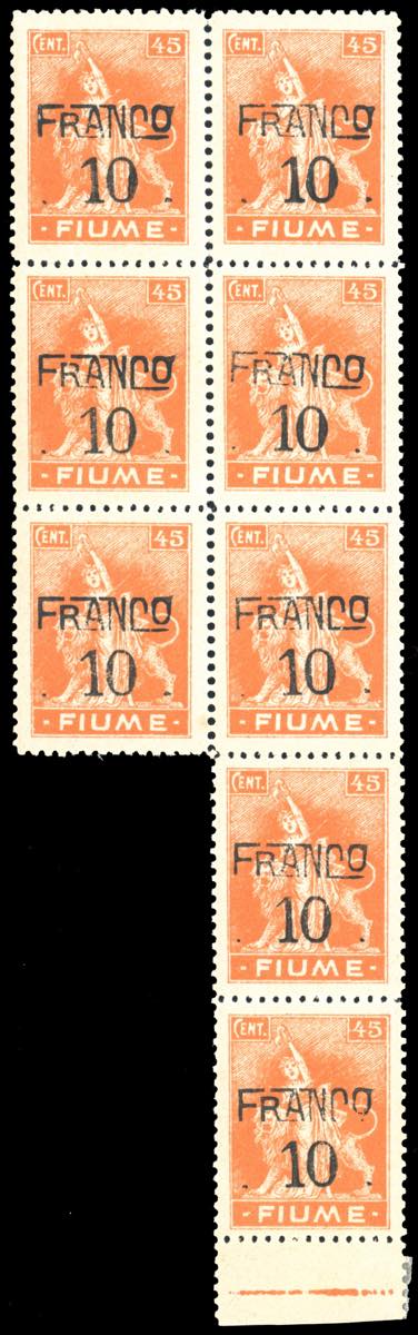 FIUME 1919 - 10 cent. su 45 cent., carta A (A77), blocco di otto esemplari, tre con decalco completo, due con decalco parziale, bordo di ... Read more