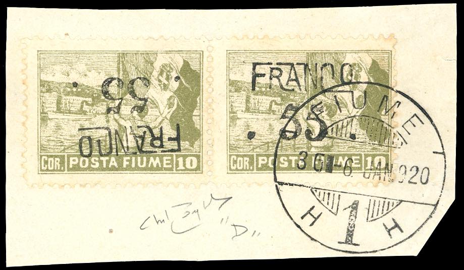 FIUME 1919/20 - 55 cent. su 10 cor. Posta Fiume, soprastampato "FRANCO", coppia orizzontale, un esemplare con soprastampa capovolta ... Read more
