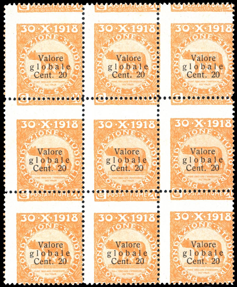 FIUME 1919 - 20 cent. su 20 cent. soprastampato "Valore globale" (91), dentellatura orizzontale fortemente spostata in alto e dentellatura verticale spostata a sinistra, blocco di nove esemplari, nuovo, gomma originale integra, perfetto. Combinazione di varietà non catalogata. Ferrario.