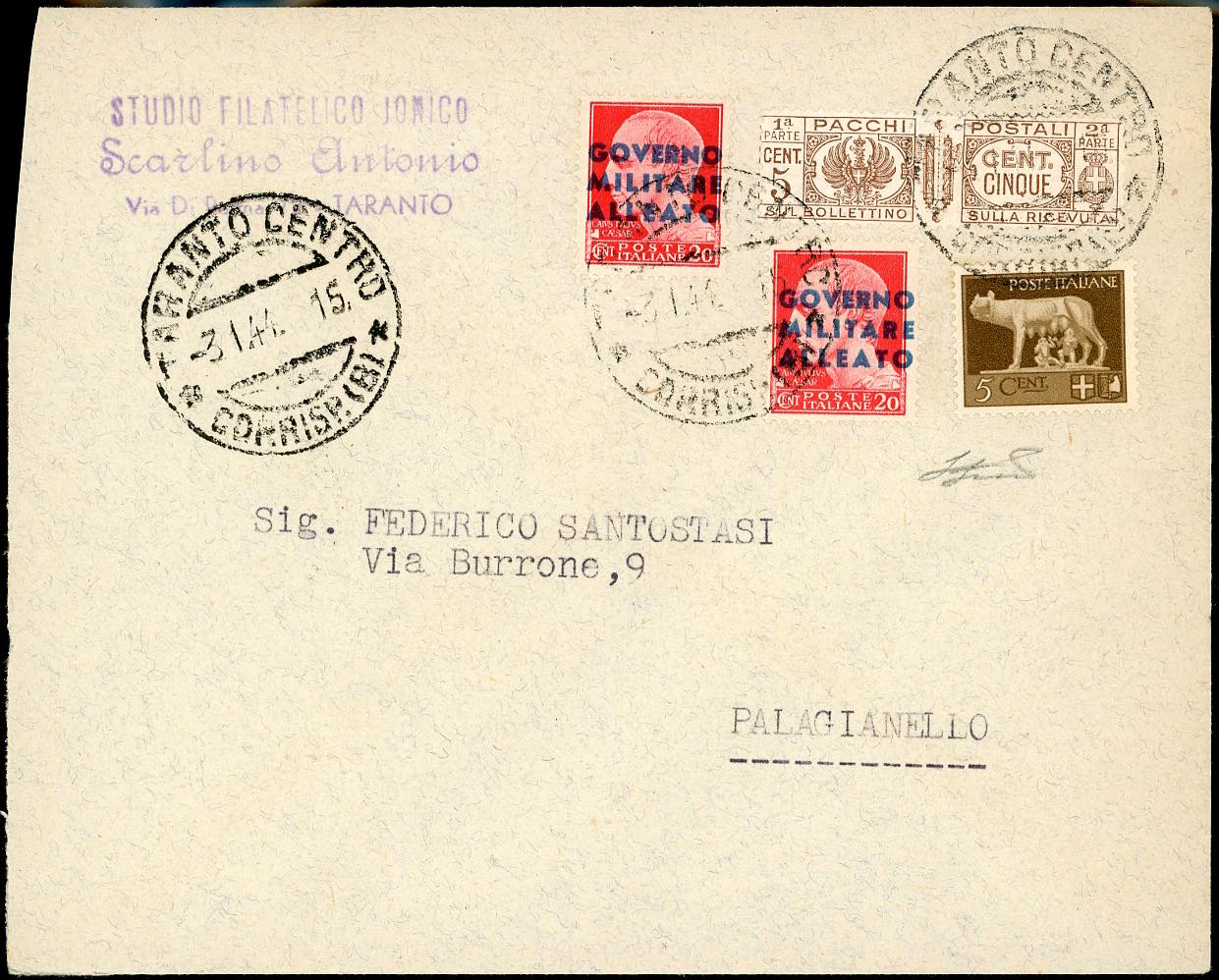 AMGOT OCCUPAZIONE ANGLO-AMERICANA NAPOLI 1944 - 20 cent. soprastampato, due esemplari (10), in affrancatura mista con 5 cent. pacchi postali e 5 cent. Imperiale (PP24,243), perfetti, su busta da Taranto 3/1/1944 a Palagianello, bollo d'arrivo. Non comune. Ferrario.