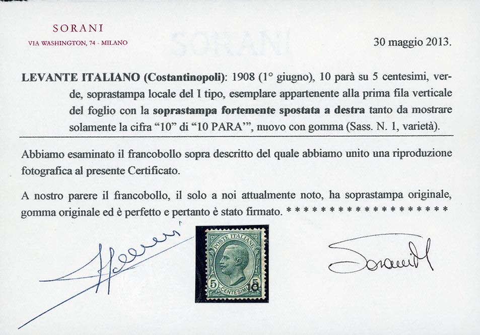 COSTANTINOPOLI 1908 - 10 para su 5 cent., I emissione locale, solo "10" in soprastampa (1cab), gomma originale, perfetto e di ottima qualità. UNICO ESEMPLARE NOTO, da annoverarsi tra le grandi rarità del settore. Cert. Sorani.