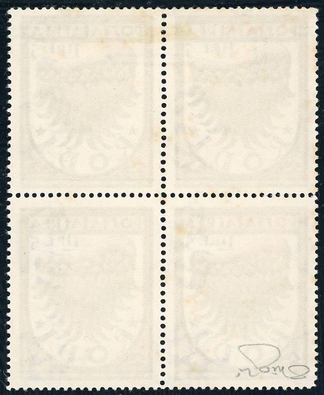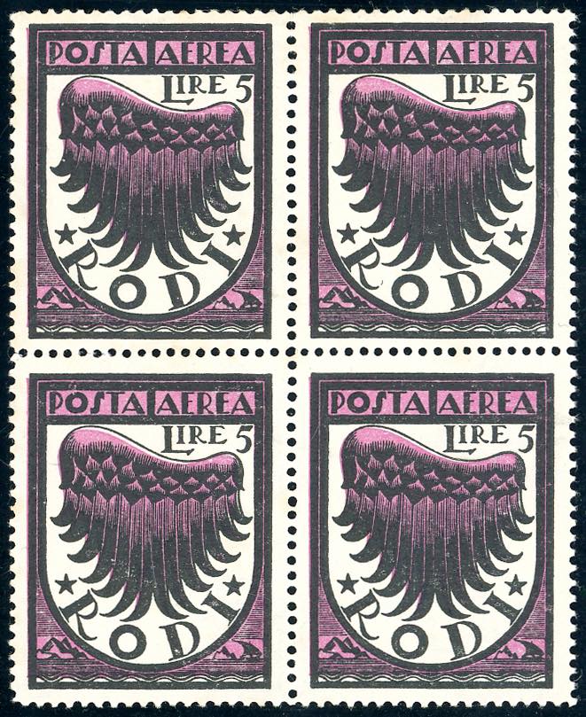 POSTA AEREA 1933 - 5 lire Ala stlizzata, II tiratura (33A), blocco di quattro, nuovo senza gomma, perfetto. Raro. Cert. Raybaudi ... Read more