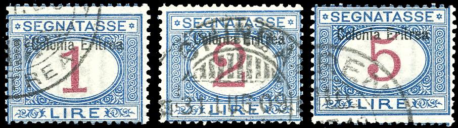 SEGNATASSE 1903 - 1 lira, 2 lire e 5 lire soprastampati in alto (8/10), usati, perfetti. Ferrario.