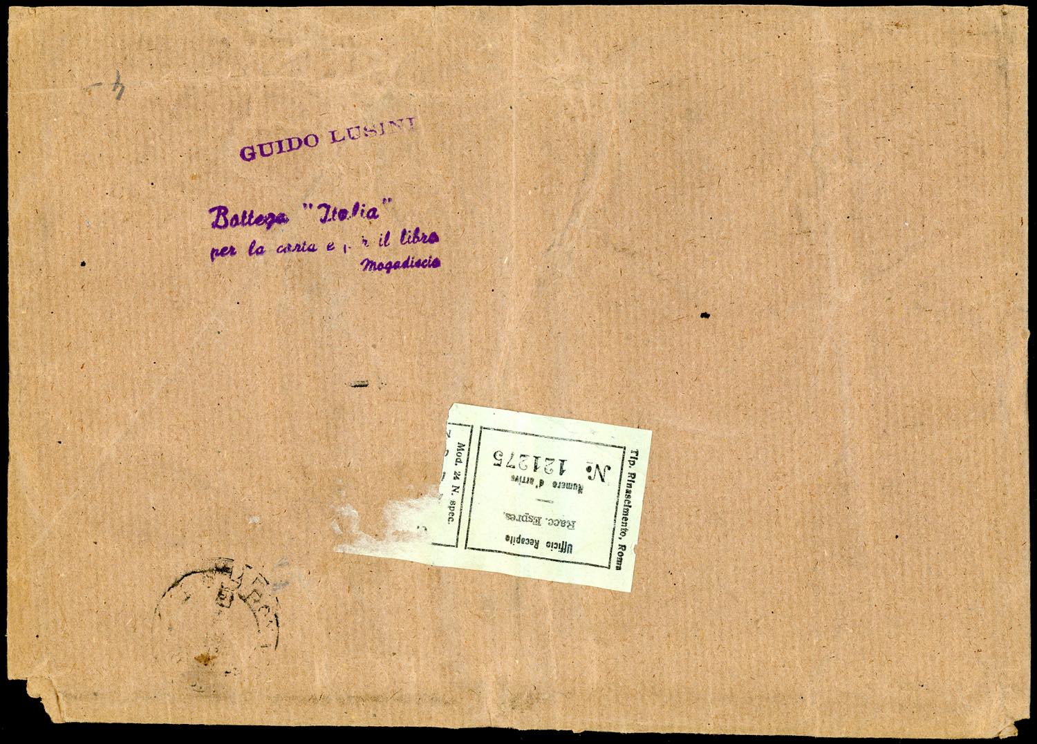 SOMALIA AFIS POSTA AEREA 1952 - 10 s. arancio, striscia di tre e coppia, 5 s. bruno e 1 s. Consiglio territoriale, coppia (A10,A11,A12), perfetti, su raccomandata espresso via aerea da Mogadiscio 28/4/1952 a Roma. Eccezionale affrancatura multipla di alto valore facciale. Rarità del settore. Cert. Sorani.