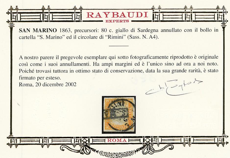 1863 - 80 cent. giallo (Sardegna 17Da,RSM A4), perfetto, annullato con il bollo in cartella di S.Marino e il datario di Rimini. Si tratta dell'UNICO ESEMPLARE NOTO di questo francobollo con annullo di San Marino. Grande rarità del settore. Cert. E.Diena, Oro Raybaudi, Ferrario.