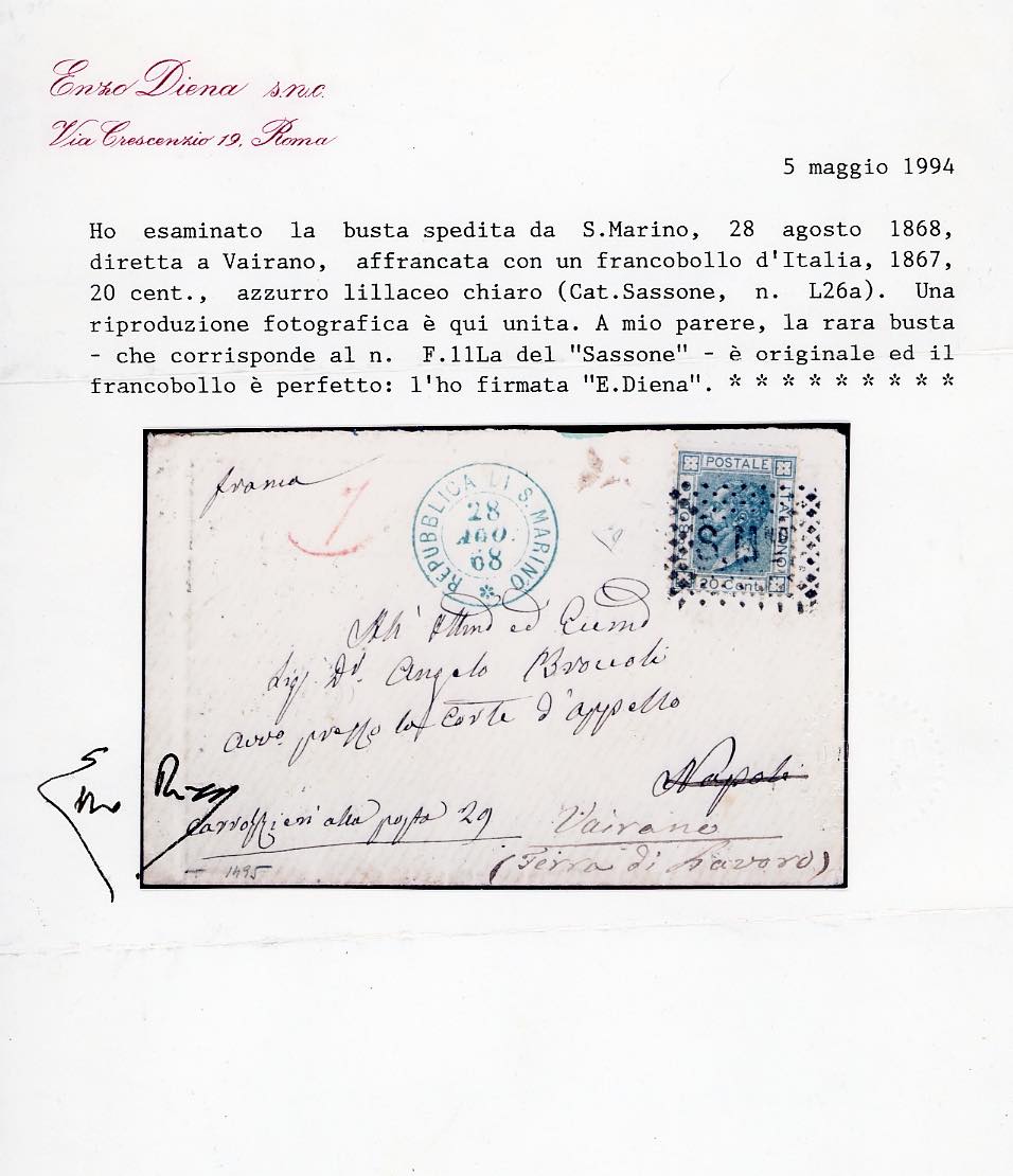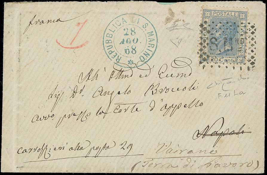1868 - 20 cent. azzurro lillaceo chiaro, tiratura di Londra (Regno L26a,RSM F11La), perfetto, su busta da S.Marino 28/8/1868, bollo a punti annullatore e doppio cerchio sul fronte, a Napoli, rispedita a Vairano. Rare rispedizione da San Marino. Ferrario, cert. Oro Raybaudi ed E.Diena.